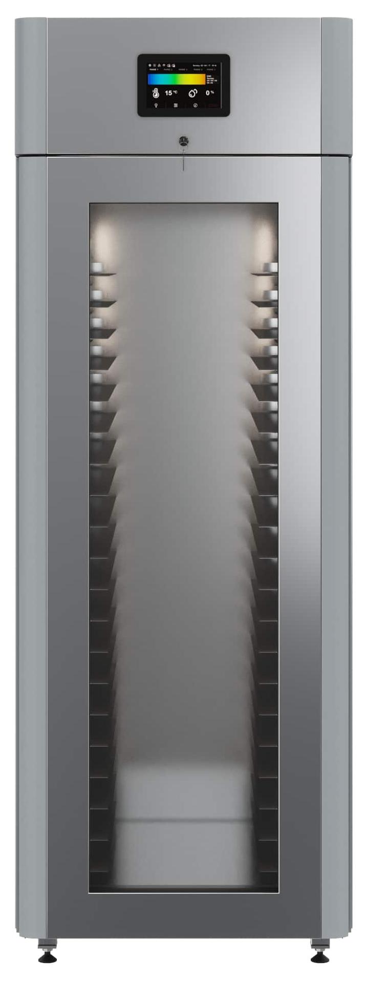 Art. 1001233d GN1/1 or EN 40x60 guide rails 20 pairs Dimensions 697x1005x1960 Case wall thickness, mm 43 Temperature range, °C -10...+40 Volume, l 700 Power supply system, V/Hz 230/50 Humidity level adjustment (range), % 60 to 95% Daily power consumption, kW/h, max 8 Cooling type dynamic with soft blowing without windblowing Refrigerant R290 Defrost type automatic Material of the interior cladding of the body stainless steel Pedal + -